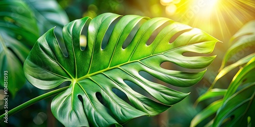 Obraz premium A vibrant green tropical leaf, illuminated by the soft glow of the sun,...