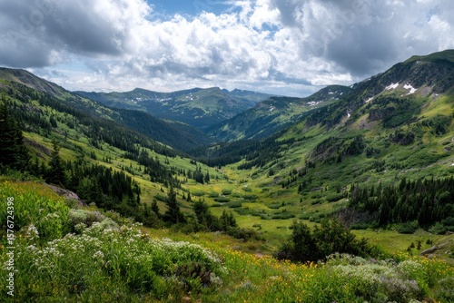 Fototapeta premium A vibrant green valley nestled between mountain ranges, wildflowers in the...