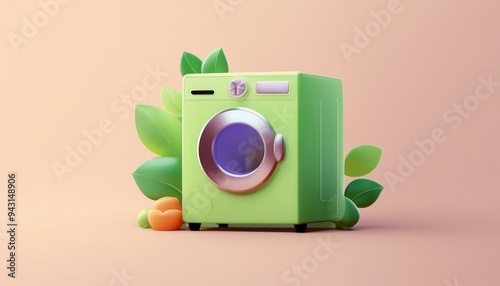 © MotionVoxel, Fototapeta premium A vibrant green washing machine surrounded by foliage, symbolizing eco-friendly laundry practices and modern design.
