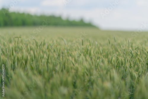 © beholdereye, Naklejka premium A Vibrant Green Wheat Field Thriving Under a Bright Blue Sky Full of Life and Energy