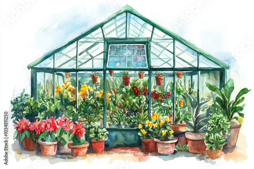 Fototapeta premium A vibrant greenhouse filled with colorful flowers and plants in decorated pots, showcasing a lush indoor garden environment.