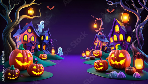 Fototapeta premium A vibrant Halloween scene with glowing pumpkins, haunted houses, spooky...