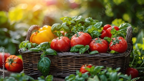 Fototapeta premium A vibrant harvest of tomatoes and basil in a rustic basket under the warm...