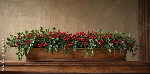 Naklejka premium A vibrant holly sprig with bright red berries nestled in a rustic wooden mantlepiece , holiday, holly, detail