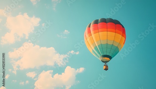 Fototapeta premium A vibrant hot air balloon floats gracefully in a clear blue sky, surrounded...