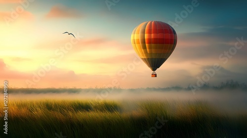 © Linlyart, Obraz premium A vibrant hot air balloon floats serenely over a misty field at sunrise, with soft colors illuminating the sky.