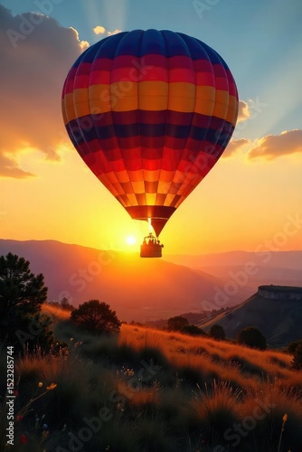 Fototapeta premium A vibrant hot air balloon gracefully ascends against a breathtaking sunrise,...