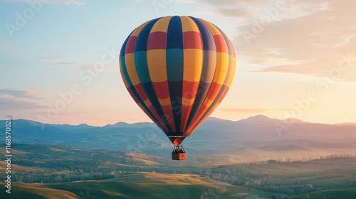 Fototapeta premium A vibrant hot air balloon soars over picturesque hills during a serene...