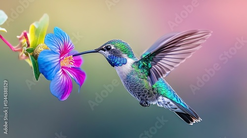 © eGGie, Obraz premium A vibrant hummingbird feeding on a colorful flower.