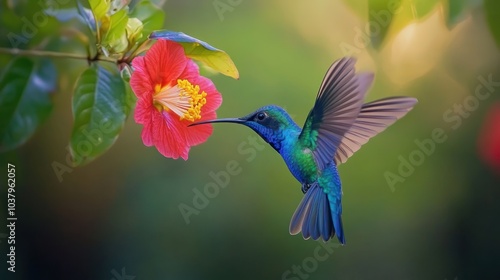 Fototapeta premium A vibrant hummingbird feeding on a colorful hibiscus flower in a lush garden setting.