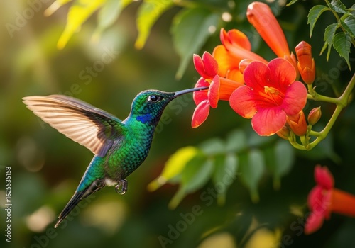 © Sifat13214, Obraz premium A vibrant hummingbird feeding on bright orange flowers in the sunlight