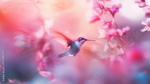 Naklejka premium A vibrant hummingbird flits among colorful flowers, creating a dreamy, ethereal atmosphere.