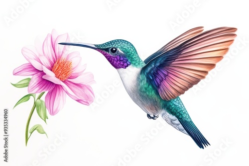 Obraz premium A vibrant hummingbird gracefully feeding on a beautiful flower, capturing the...