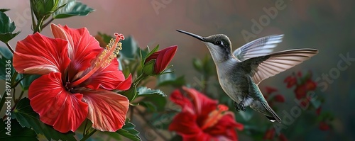 Naklejka premium A vibrant hummingbird hovering near a bright hibiscus flower, showcasing...