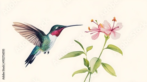 Fototapeta premium A vibrant hummingbird hovering near a delicate flower, showcasing its iridescent feathers against a light solid color background