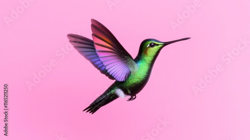 Fototapeta premium A vibrant hummingbird in flight against a pink background.