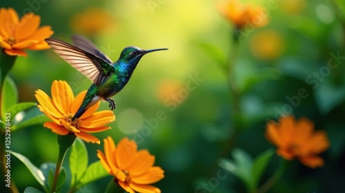 Naklejka premium A Vibrant Hummingbird in Flight, Gracefully Hovering Near Bright Orange Blossoms in a Lush Garden, Capturing the Essence of Nature's Beauty