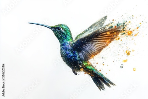 © Sena, Obraz premium A vibrant hummingbird in flight, its iridescent feathers dissolving into sparkling dust.