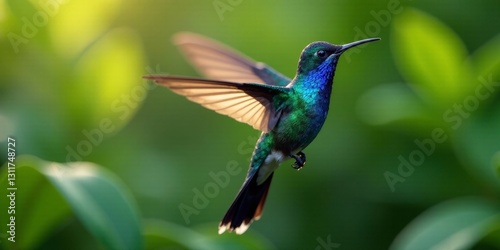 © Bh_19, Fototapeta premium A Vibrant Hummingbird in Flight, Wings Spread Wide, Soaring Through Lush Green Foliage, Bathed in Golden Sunlight