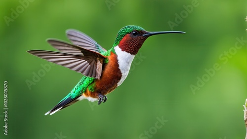 Fototapeta premium A vibrant hummingbird in mid-flight showcasing its colorful plumage against a...