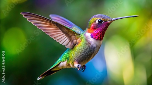 Fototapeta premium A vibrant hummingbird in mid-flight with wide-spread wings and extended beak...