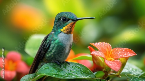 Fototapeta premium A vibrant hummingbird perched on a green leaf with red flowers in the...