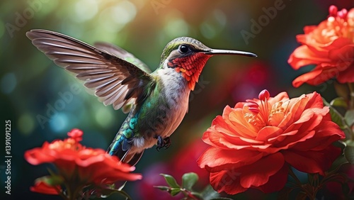 © MST, Obraz premium A vibrant hummingbird with iridescent blue and green feathers hovers mid-air