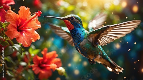 Fototapeta premium A vibrant hummingbird with iridescent blue and green feathers hovers mid-air