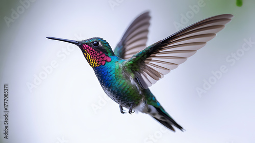 © @ak, Fototapeta premium A vibrant hummingbird with iridescent feathers hovers midair, wings outstretched