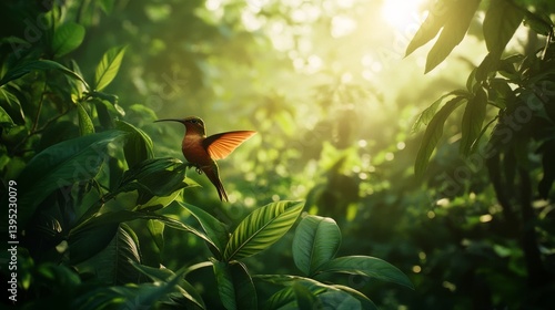 Fototapeta premium A vibrant hummingbird with reddish wings perches on lush greenery under warm, golden sunlight.