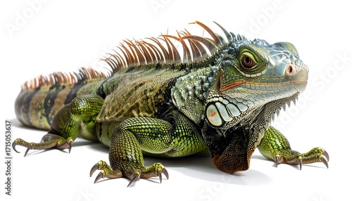 © Gelar, Obraz premium A vibrant iguana, displaying intricate scales and spiky crest, is presented against a plain white background.