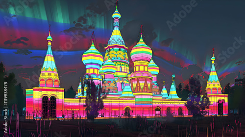 Naklejka premium A vibrant, illuminated architectural structure under a colorful sky.
