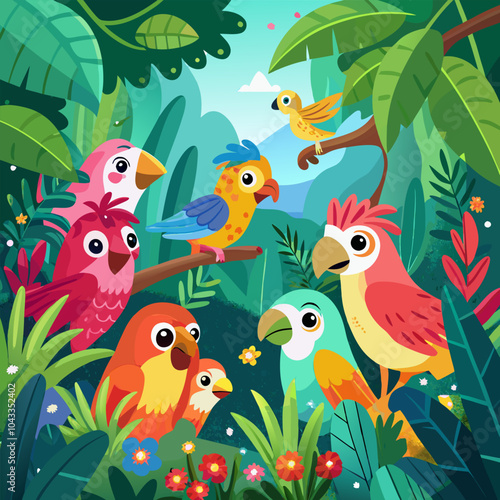 © Mohamed, Naklejka premium A vibrant illustration depicting a diverse group of colorful parrots in a lush tropical jungle. The birds, with their unique personalities and expressive features.