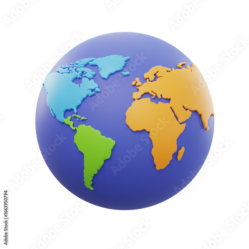 © Asahanku, Fototapeta premium A vibrant illustration depicts a spherical representation of the world, showcasing continents in diverse hues, set against a deep background, symbolizing global unity and interconnectedness.