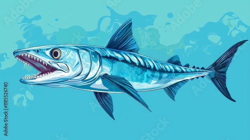 Fototapeta premium A vibrant illustration of a barracuda swimming in a blue ocean, showcasing its sharp teeth and streamlined body.