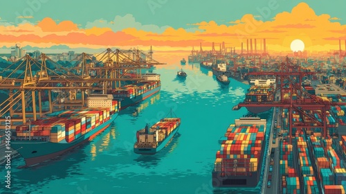 Obraz premium A vibrant illustration of a busy harbor at sunset, showcasing ships and containers amidst a colorful skyline.
