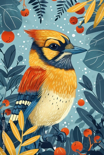 © Tina, Obraz premium A vibrant illustration of a colorful bird surrounded by foliage and berries.