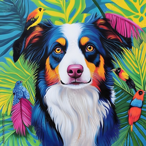 © Satya, Naklejka premium A vibrant illustration of a dog surrounded by colorful birds and tropical foliage.