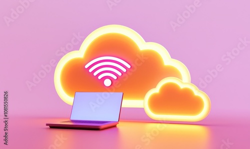 Fototapeta premium A vibrant illustration of a laptop with glowing cloud icons, symbolizing cloud computing and wireless connectivity.