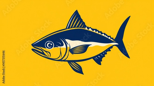 Naklejka premium A vibrant illustration of a stylized tuna fish with dark blue detailing, set against a bright yellow background