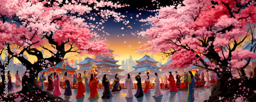 Obraz premium A vibrant illustration of a traditional Asian festival under cherry blossoms with people in cultural attire, evoking celebration, tradition, and the beauty of spring.