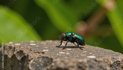 Fototapeta premium A vibrant illustration of an emerald-green fly beetle perched on a rock amidst a natural setting
