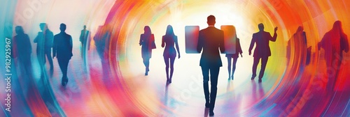 © SKIMP Art, Obraz premium A vibrant illustration of business people walking through a circular pattern, with the silhouette of one person standing out in focus amidst blurred figures Generative AI