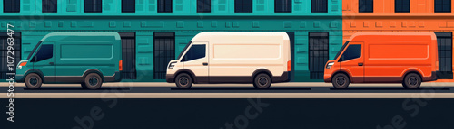 © Wonderful Studio, Naklejka premium A vibrant illustration of three delivery vans in varied colors parked along a stylized urban backdrop.