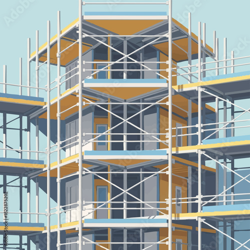 Fototapeta premium A vibrant illustration showcases a building under construction, enveloped in scaffolding, set against a clear blue sky, depicting architectural progress.