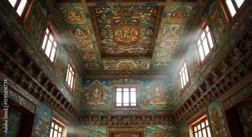 © dariyah, Obraz premium A vibrant interior of a temple, featuring intricate murals and sunlight streaming through windows