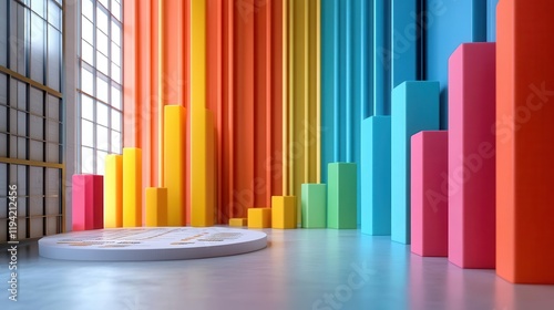 © ZpongXED, Obraz premium A vibrant interior scene featuring colorful vertical bars against a bright wall, creating a lively atmosphere perfect for presentations or creative spaces.