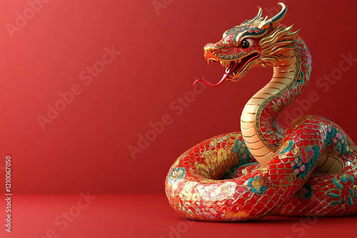 © s1llu, Obraz premium A vibrant, intricately designed dragon sculpture with a red and gold color scheme, coiled elegantly against a solid red background.