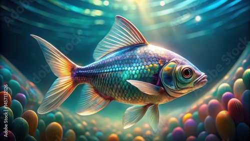 Fototapeta premium A Vibrant Iridescent Fish Swims Through a Dreamlike Underwater World of...