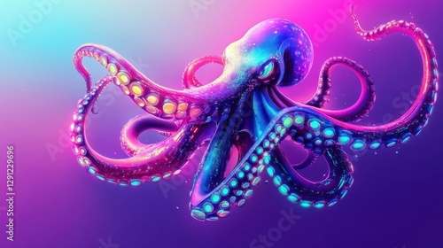 Obraz premium A vibrant iridescent octopus swims in neon light